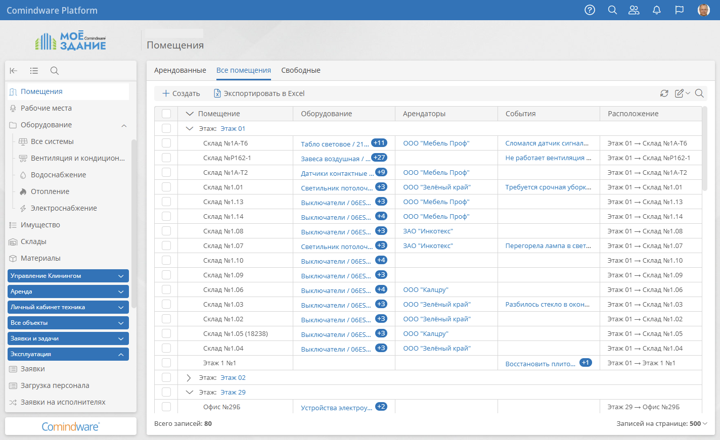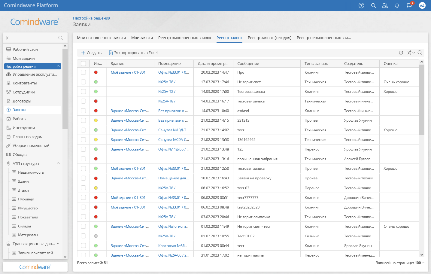 Для удобного контроля выполнения заявок в системе Comindware Моё здание имеются электронные реестры. В таких реестрах можно узнать информацию о статусе заявки по цветному индикатору, а также отфильтровать данные заявок по различным параметрам и признакам. Это позволяет проанализировать актуальные данные по заявкам и выявить, какие типы заявок выполняются быстрее или медленнее остальных, какие помещения здания чаще других нуждаются в ремонте, какие сотрудники более оперативны и пр.