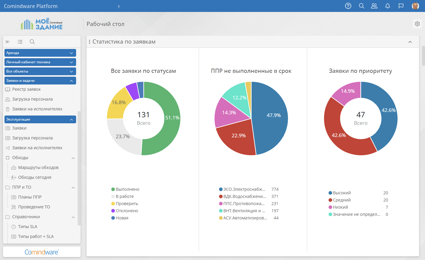 Повысить эффективность контроля заявок в Comindware Моё здание помогают отчёты, которые автоматически формируются из данных по заявкам. Это могут быть сводные отчёты, отчёты по видам работ, отчёты с диаграммами и пр. Система позволяет создать и настроить дополнительные отчёты с привязкой тем или иным метрикам.